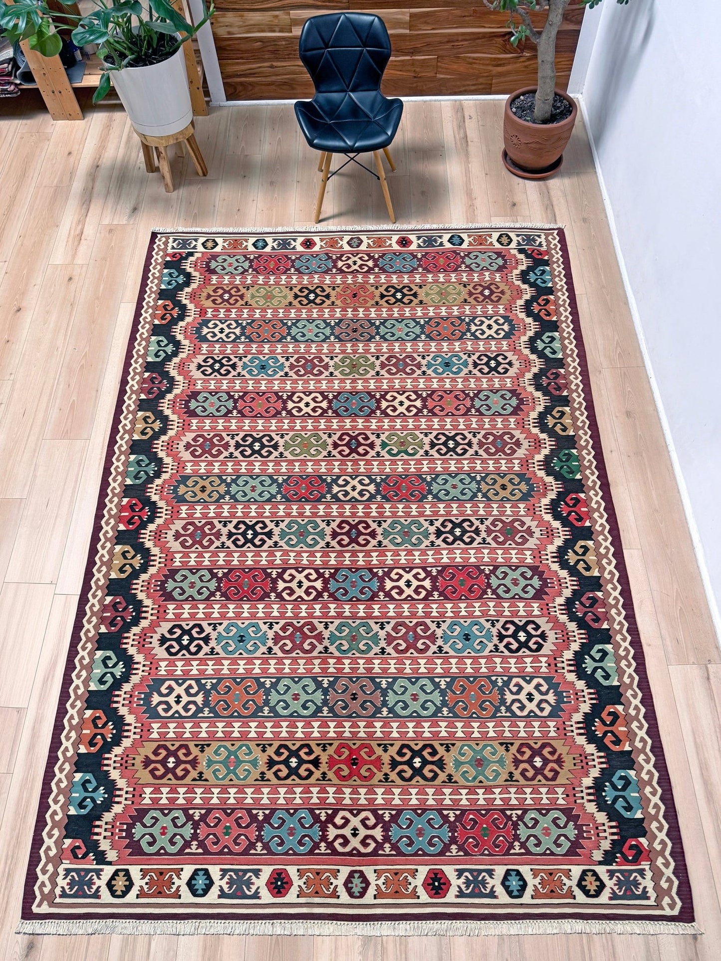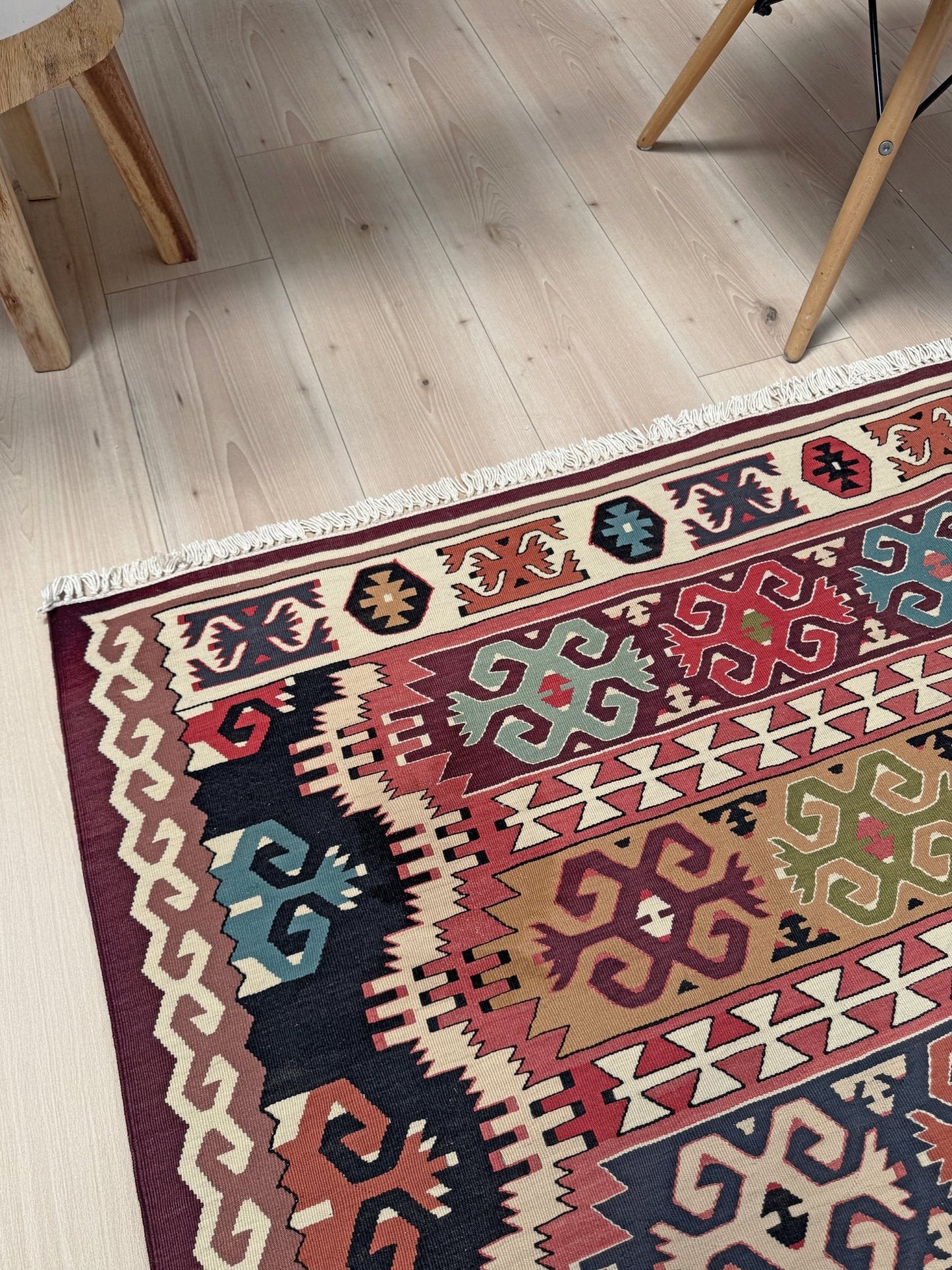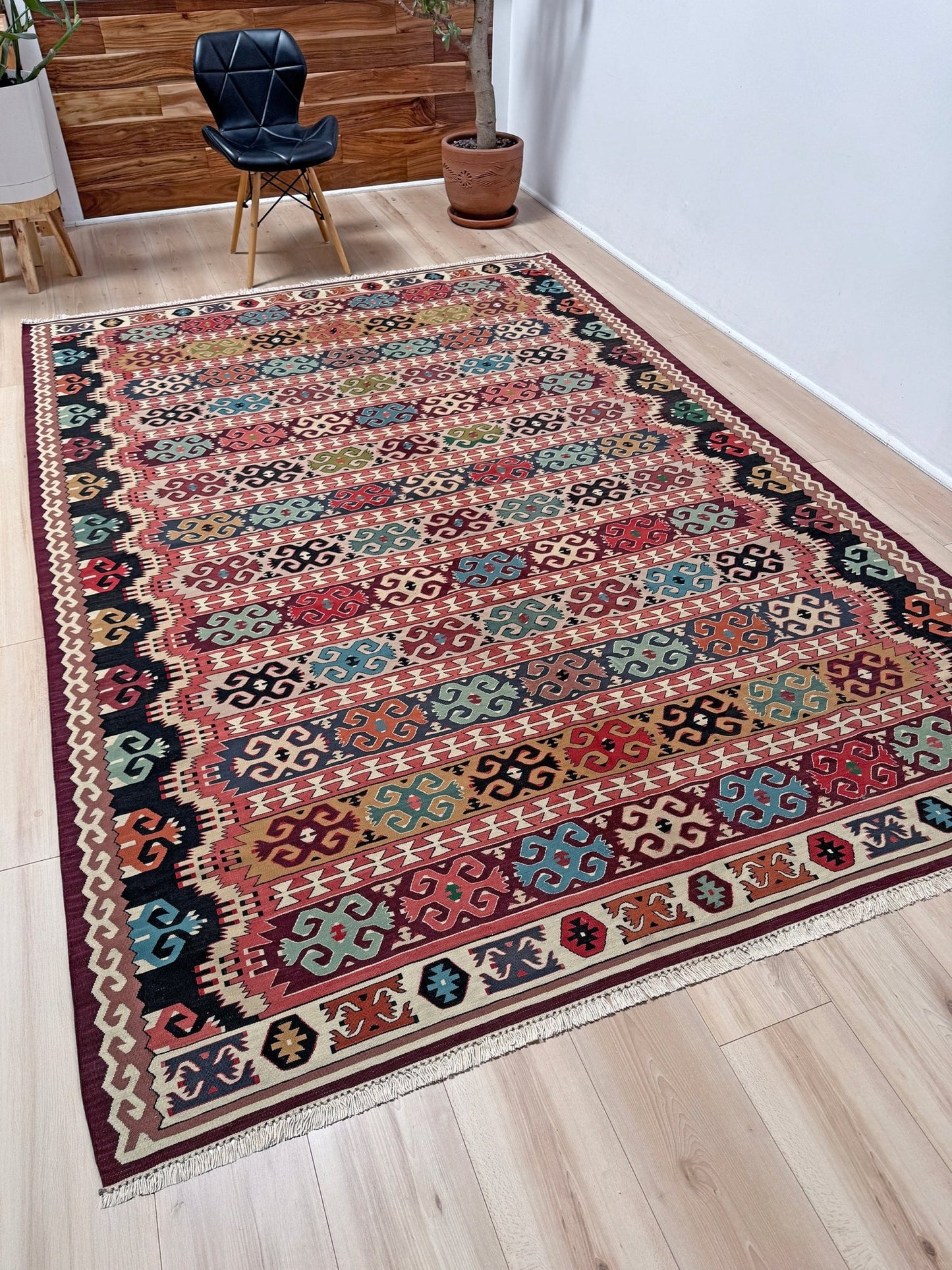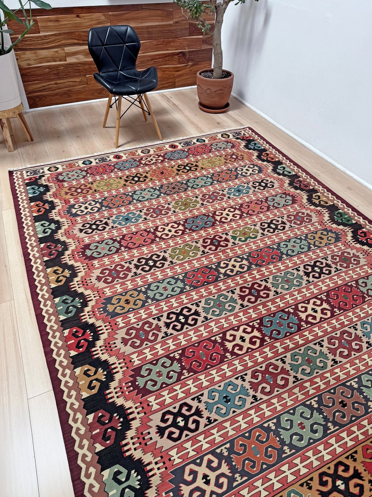 Pirot Vintage European Kilim Rug • Handmade Flatweave Wool Carpet • 6x9 Geometric Rug for Living Room, Bedroom, Dining, Kitchen & Study