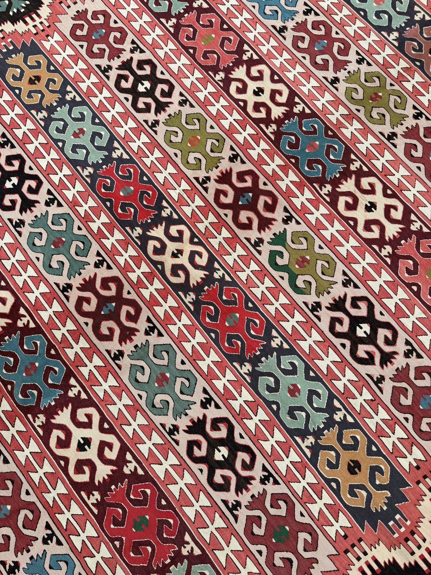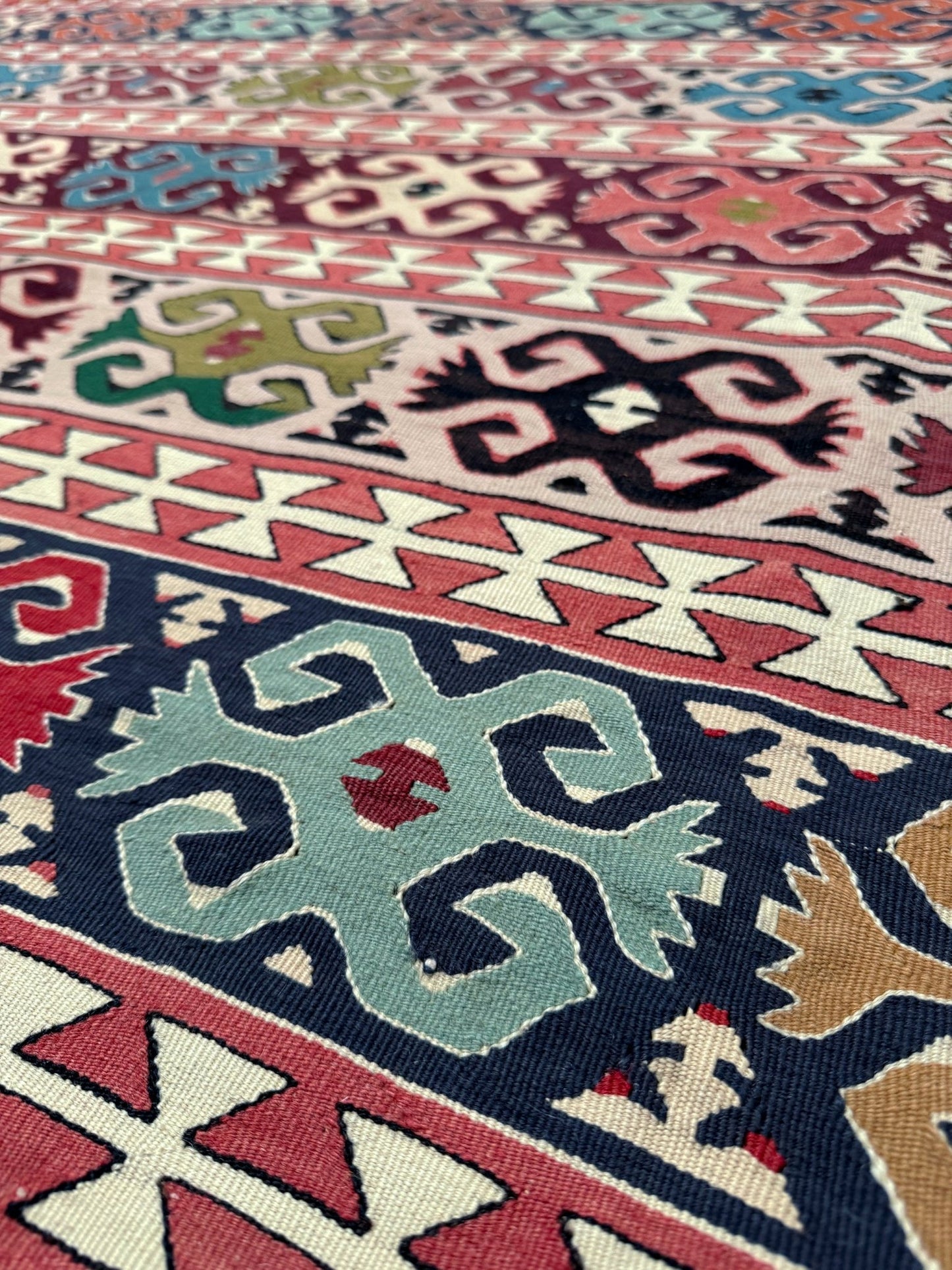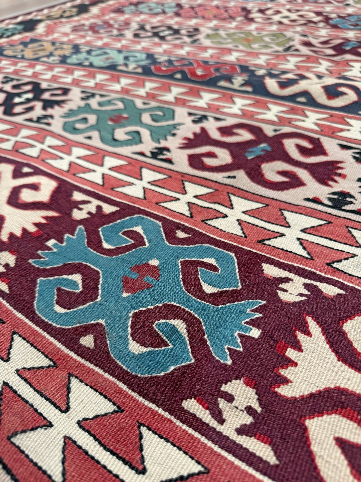 ✔ This Pirot Balkan vintage kilim is a joyful symphony of handwoven history, bringing a spirited charm straight from Southeast Europe to your space. Its rhythmic, geometric stripes dance across the flatweave in rich hues of brick red, earthy olive, deep indigo, and sun-kissed ochre, creating a visual tempo that's both playful and grounding. The contrast of warm and cool tones gives the rug an effortless versatility—bold enough to anchor a room, yet refined enough to complement softer surroundings. Crafted entirely from wool, it’s not just a rug, it’s a tactile celebration of tradition, movement, and soul.