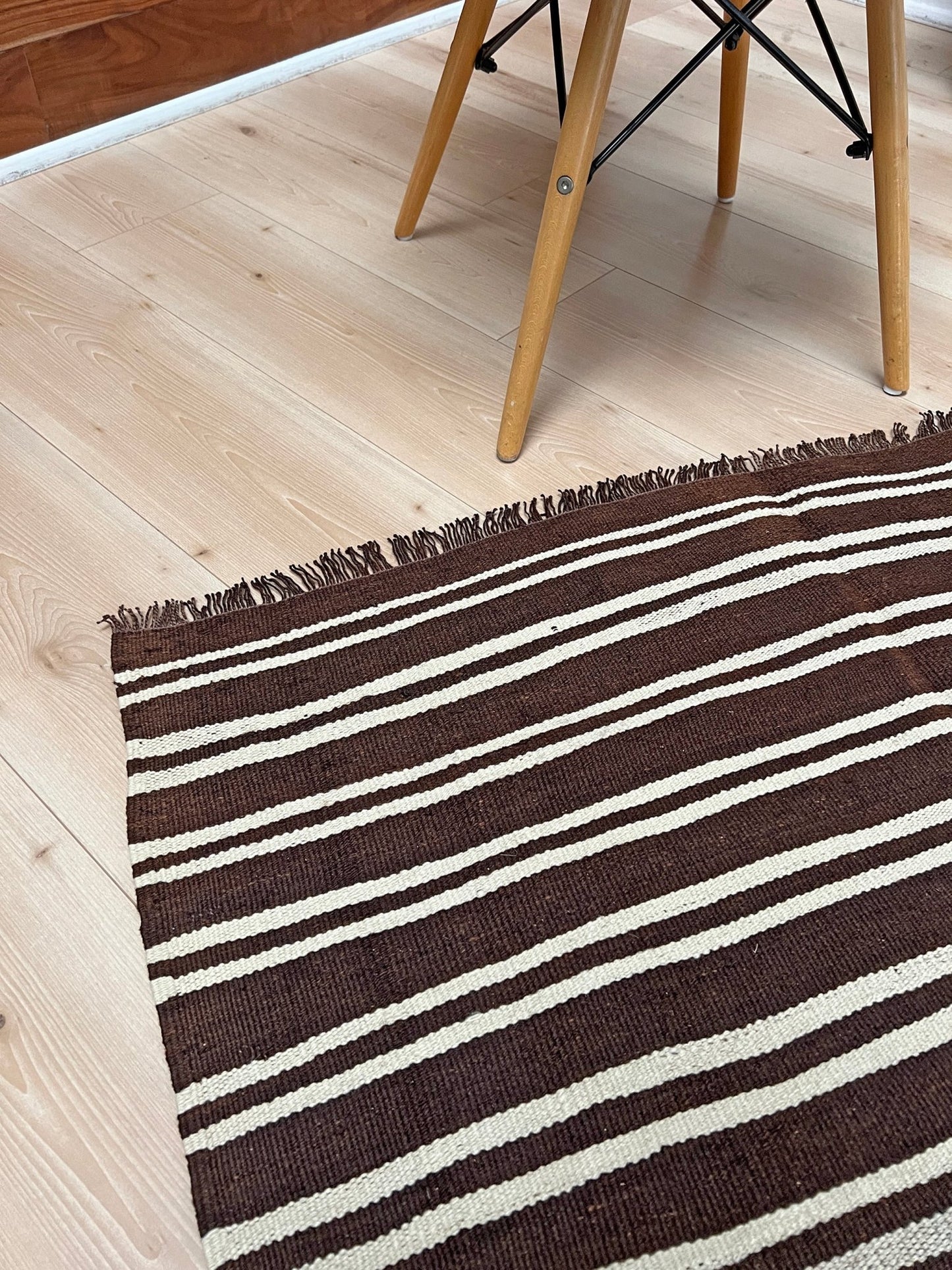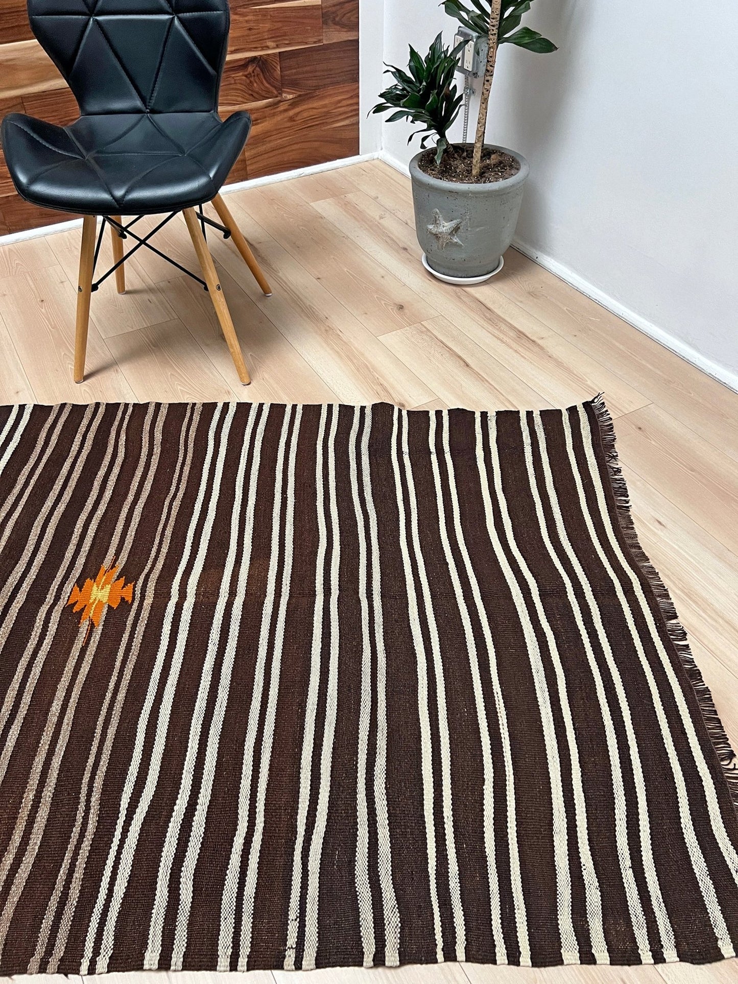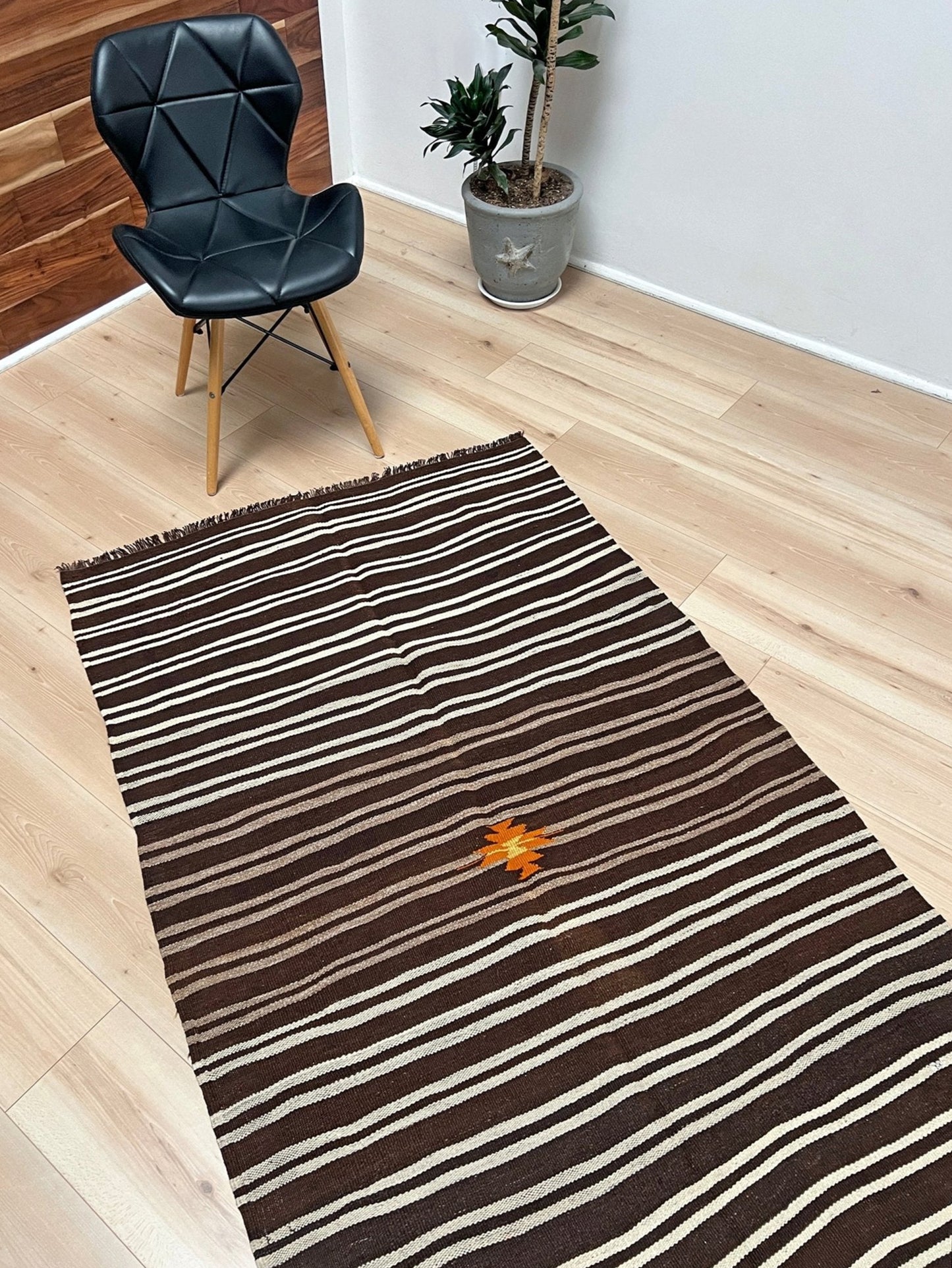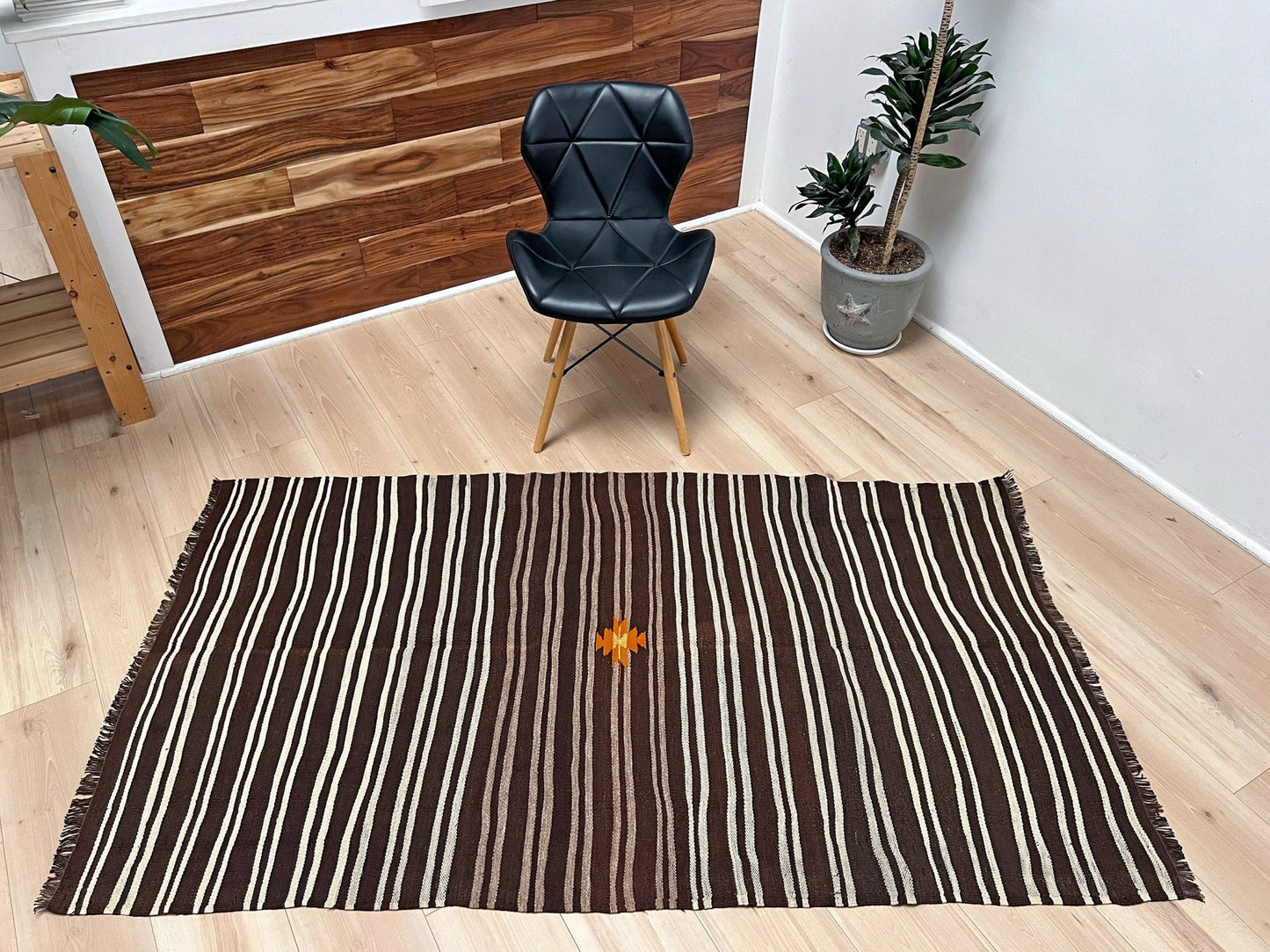 Vintage Turkish Kilim Rug • Handmade Wool Carpet • 4x6 Small Brown Striped Flatweave Rug for Living Room, Bedroom, Kitchen & Nursery