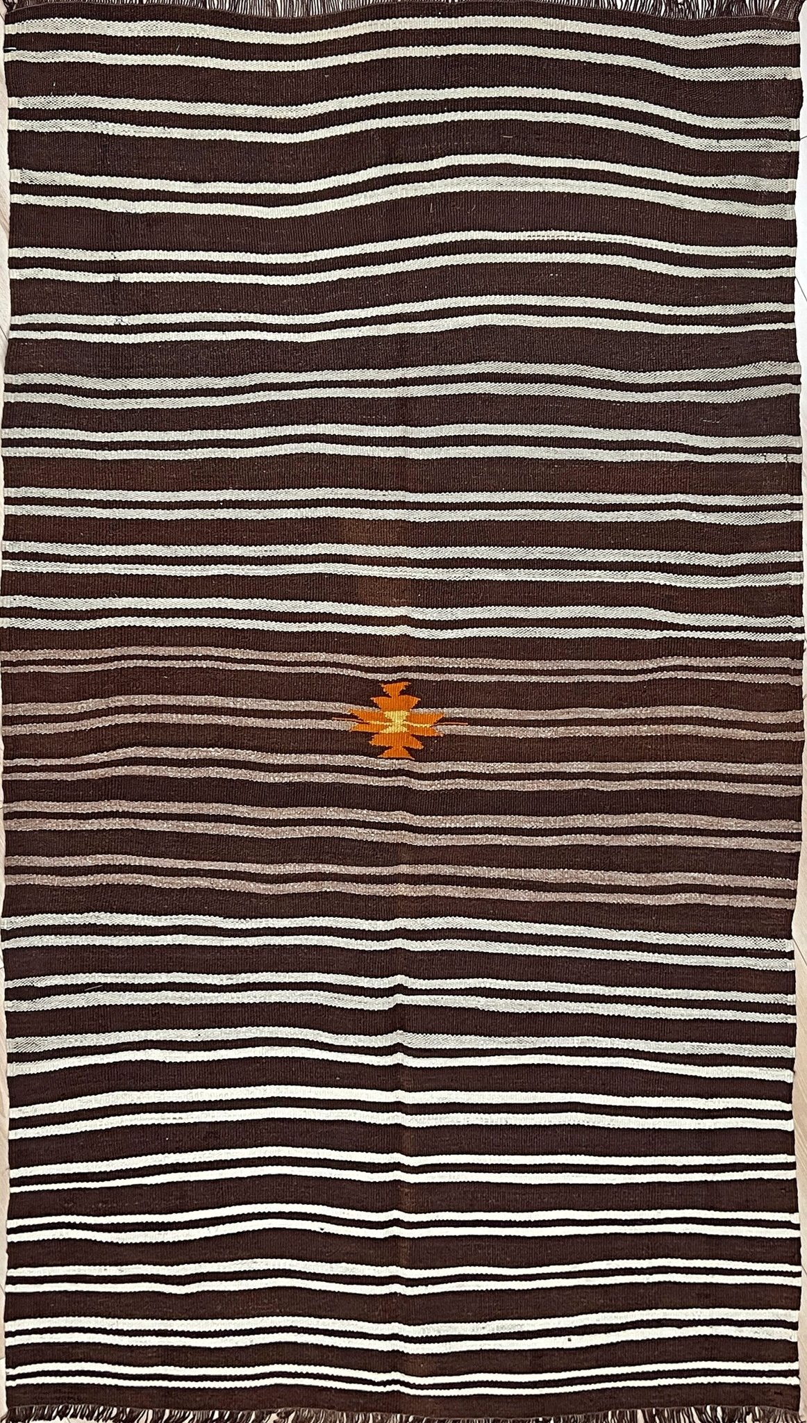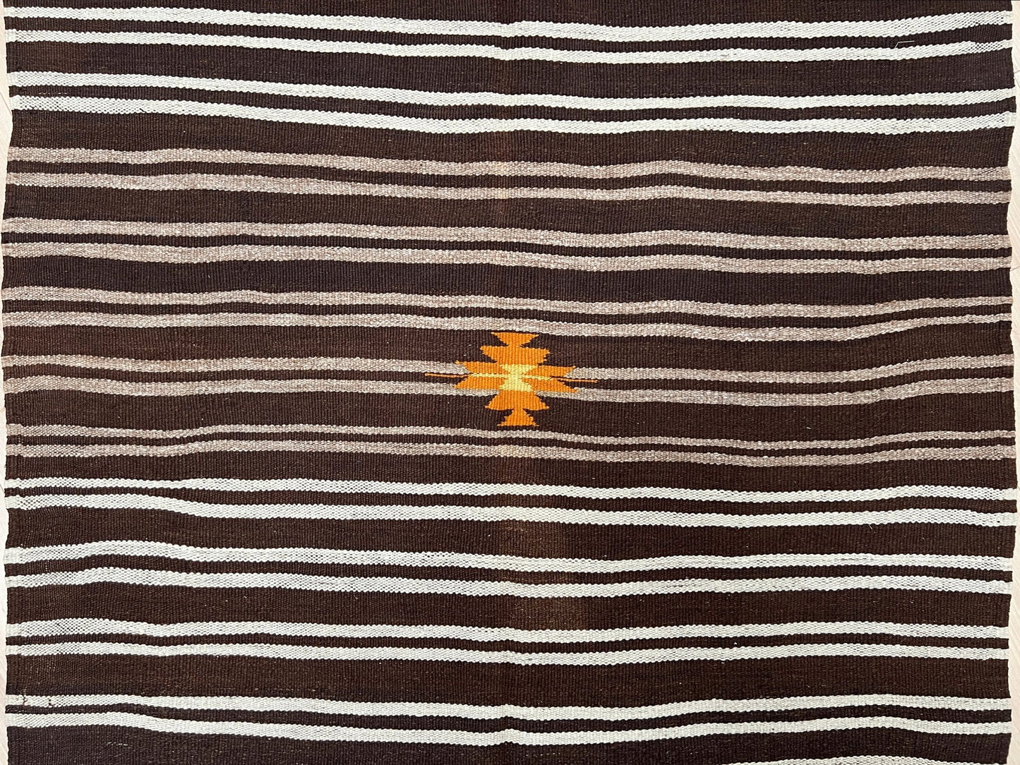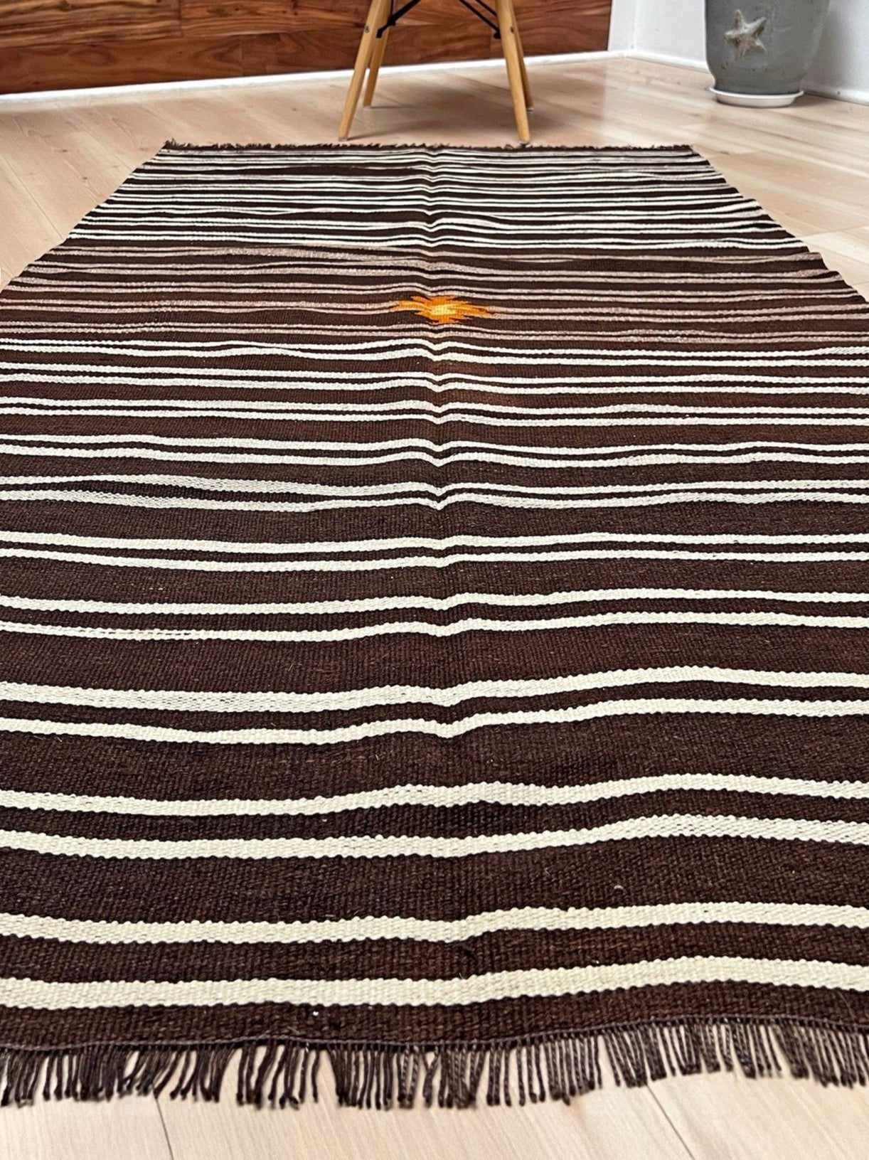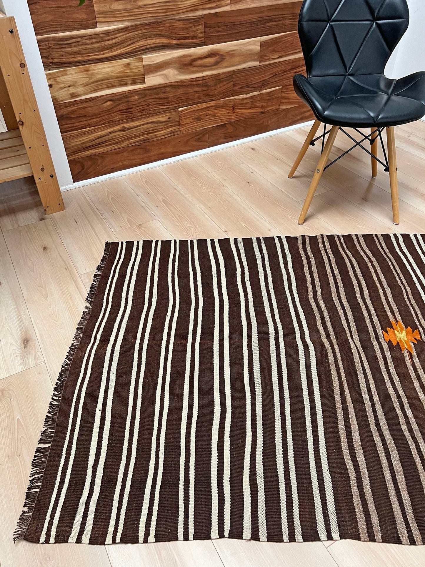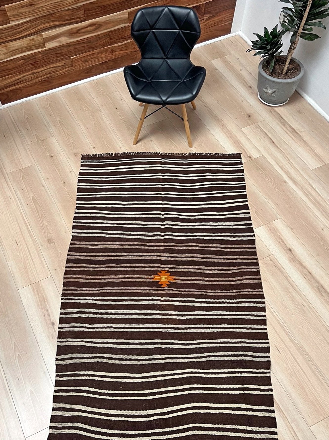 Vintage Turkish Kilim Rug • Handmade Wool Carpet • 4x6 Small Brown Striped Flatweave Rug for Living Room, Bedroom, Kitchen & Nursery