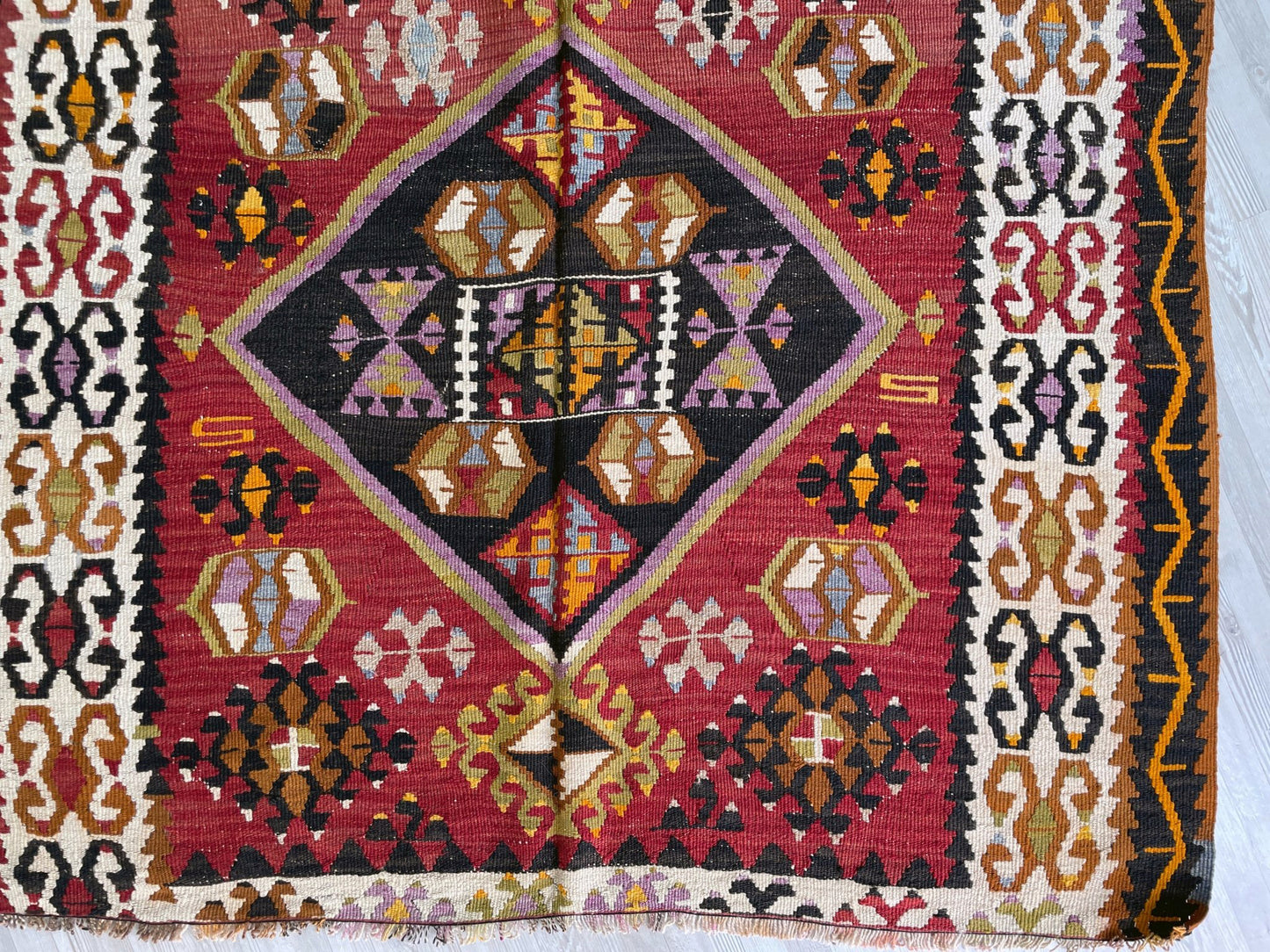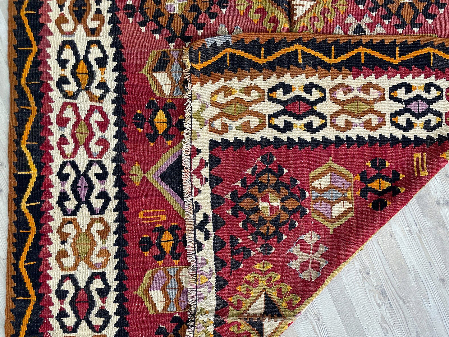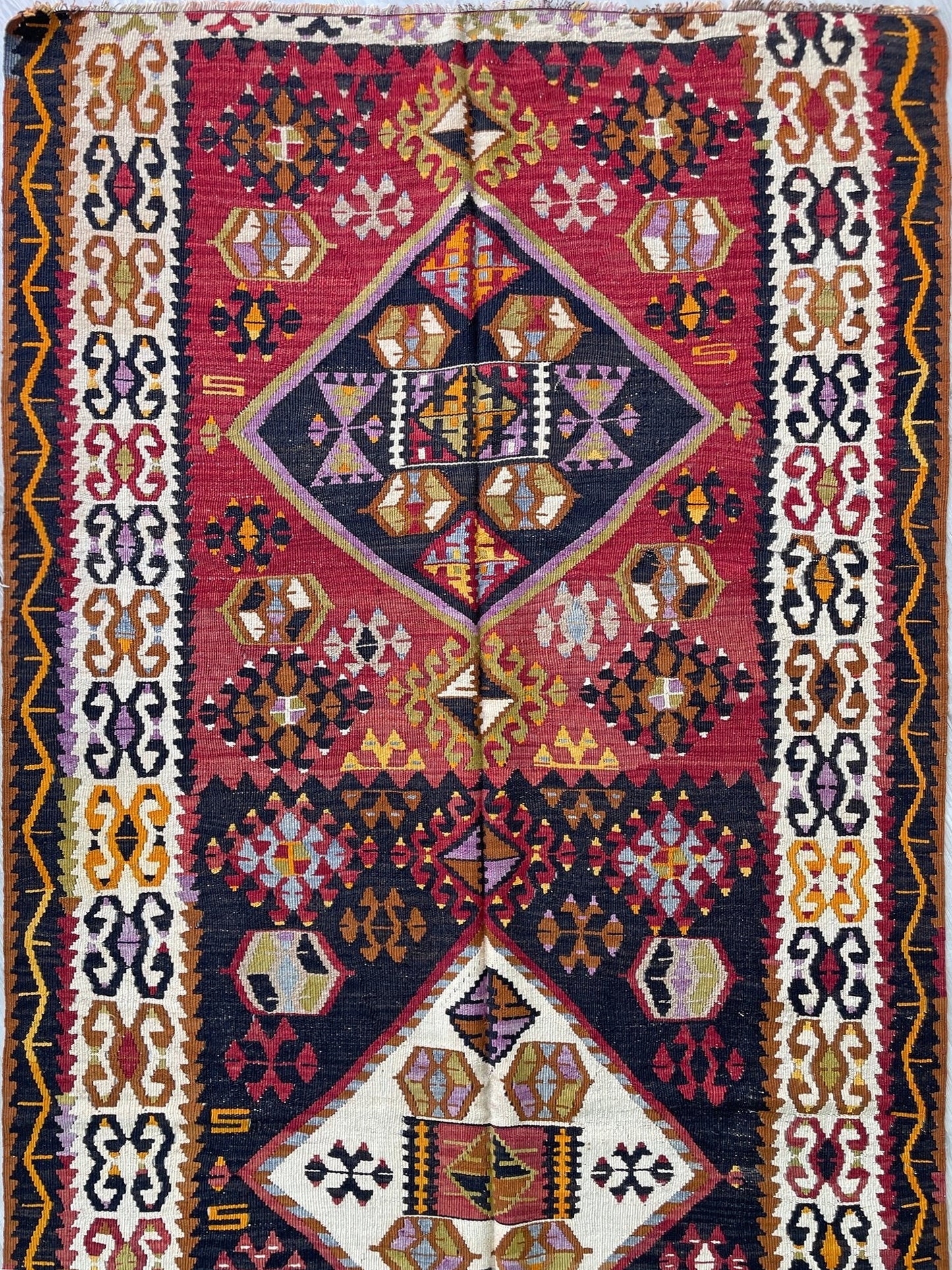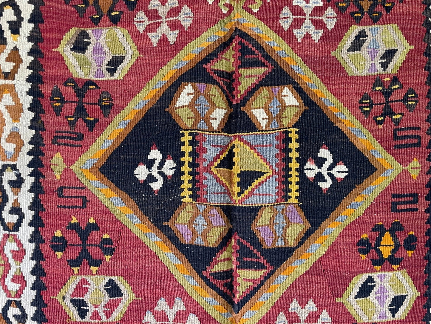 ✔  Hand made almost A CENTURY AGO, this is a perfect example of Kayseri Kilims. This very kilim rug is especially unique for its brick red and dark brown colors gracefully contrasting each other.
