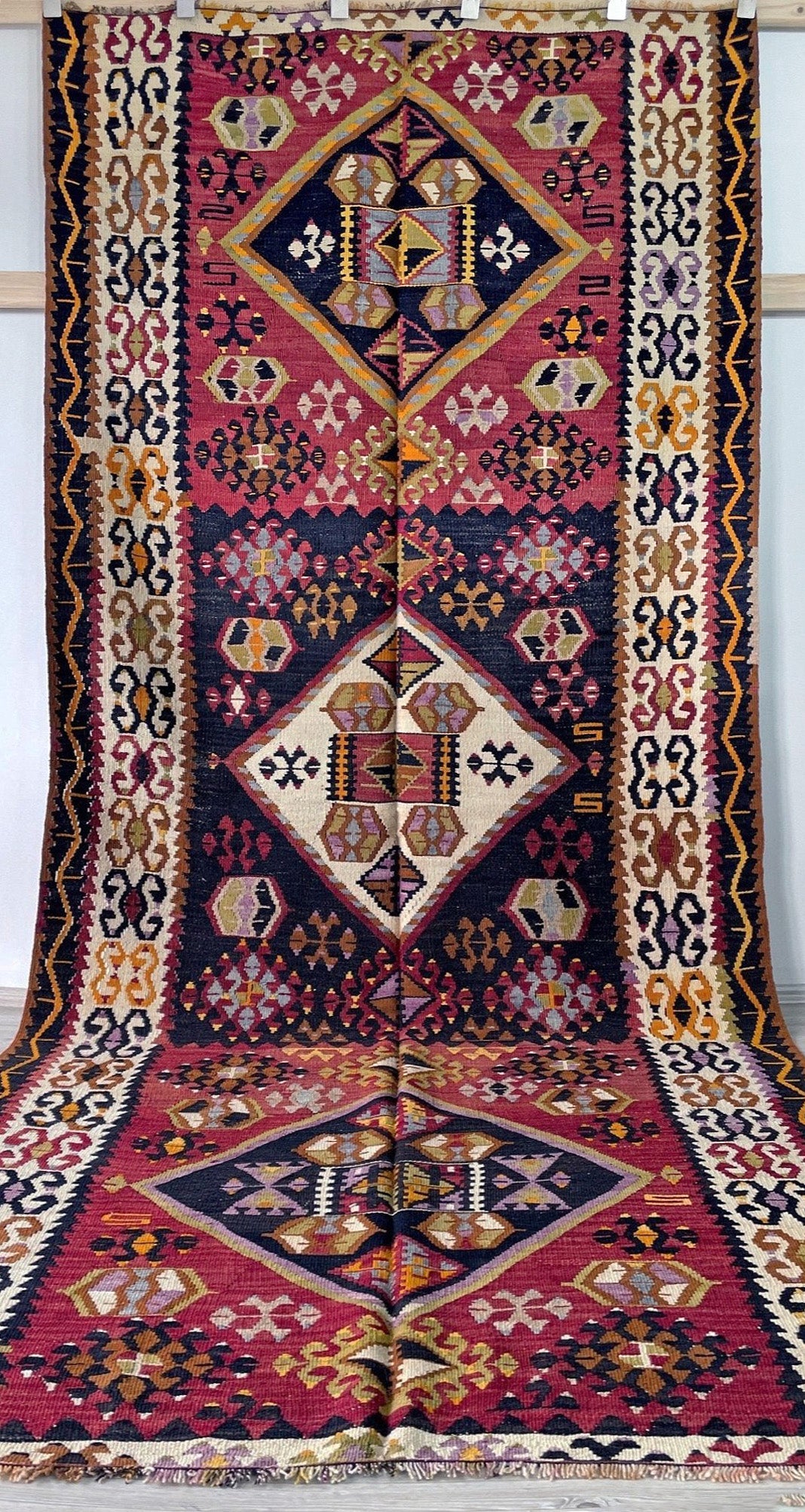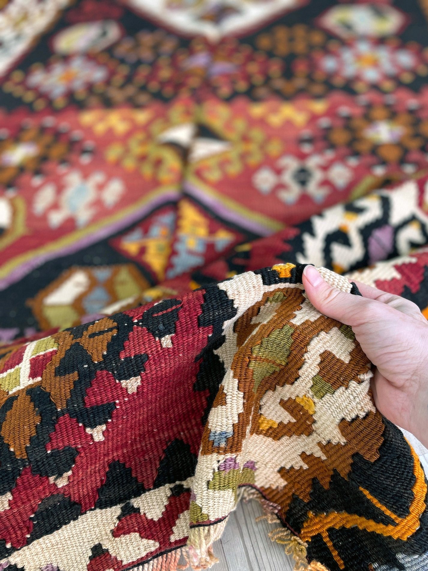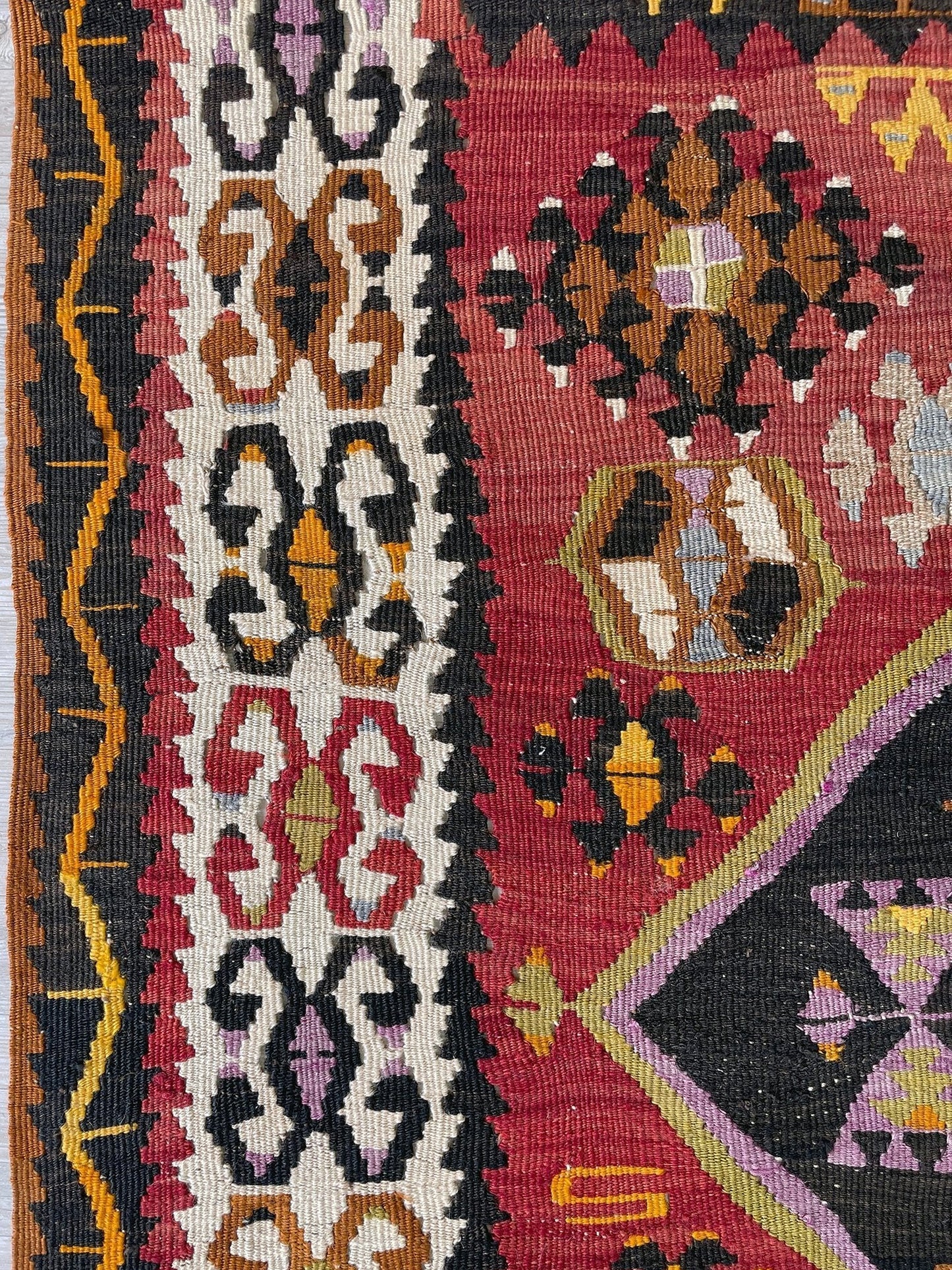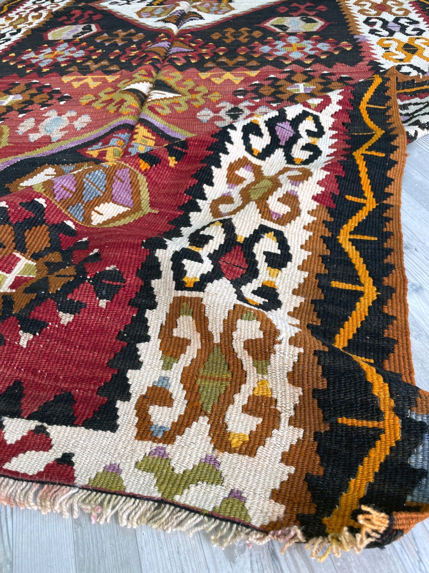 ✔  Hand made almost A CENTURY AGO, this is a perfect example of Kayseri Kilims. This very kilim rug is especially unique for its brick red and dark brown colors gracefully contrasting each other.